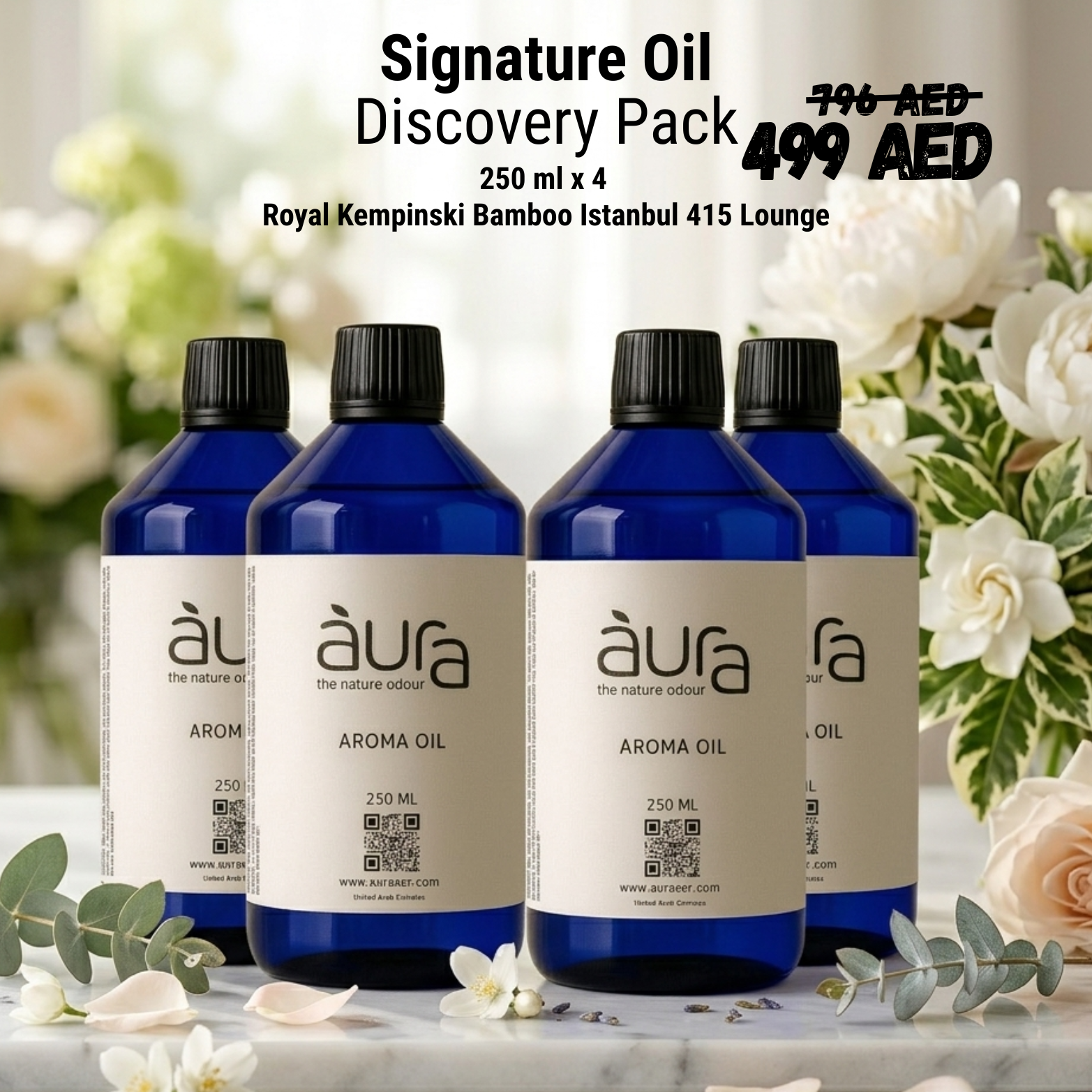 4 of AuraAer\’s most loved signature oils in one pack. Royal, Kempinski, Bamboo Istanbul, and 415 Lounge—1,000 ml of the UAE\’s finest hotel-grade scents delivered free to your door. Only AED 499.
